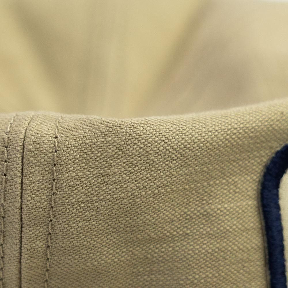 緯糸に異番手のムラ糸をミキシングで使用することでメリハリのあるムラ感を表現し、甘い打ち込みで膨らみのある風合いに仕上がっているバックサテン。顔料染めで染めておりますので、摩擦により色が落ちていき、色落ちや色褪せによって使い込んだような独特の風合いやユーズド感が出てくるため、長くエイジング感を楽しんでいただけます。