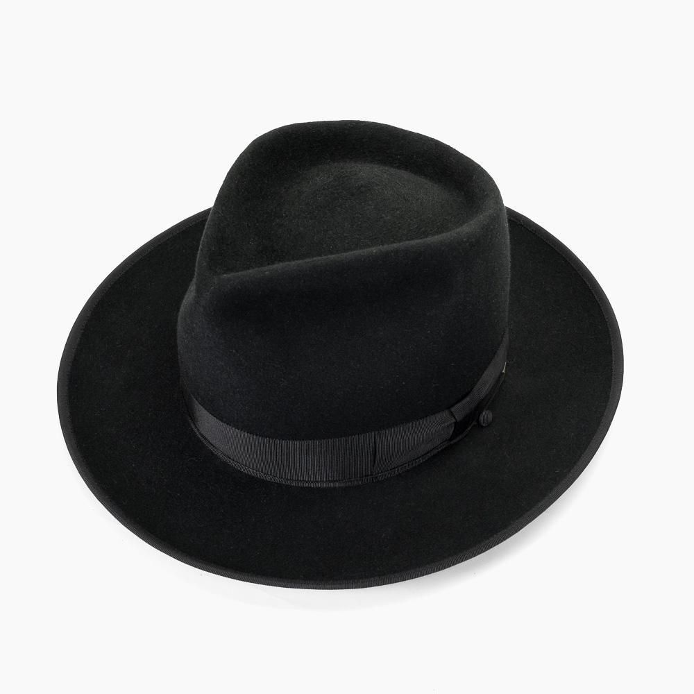 最大の特徴は、高さ13.5cmのハイクラウンと長さ8cmのロングブリムが織りなす圧倒的な存在感です。
