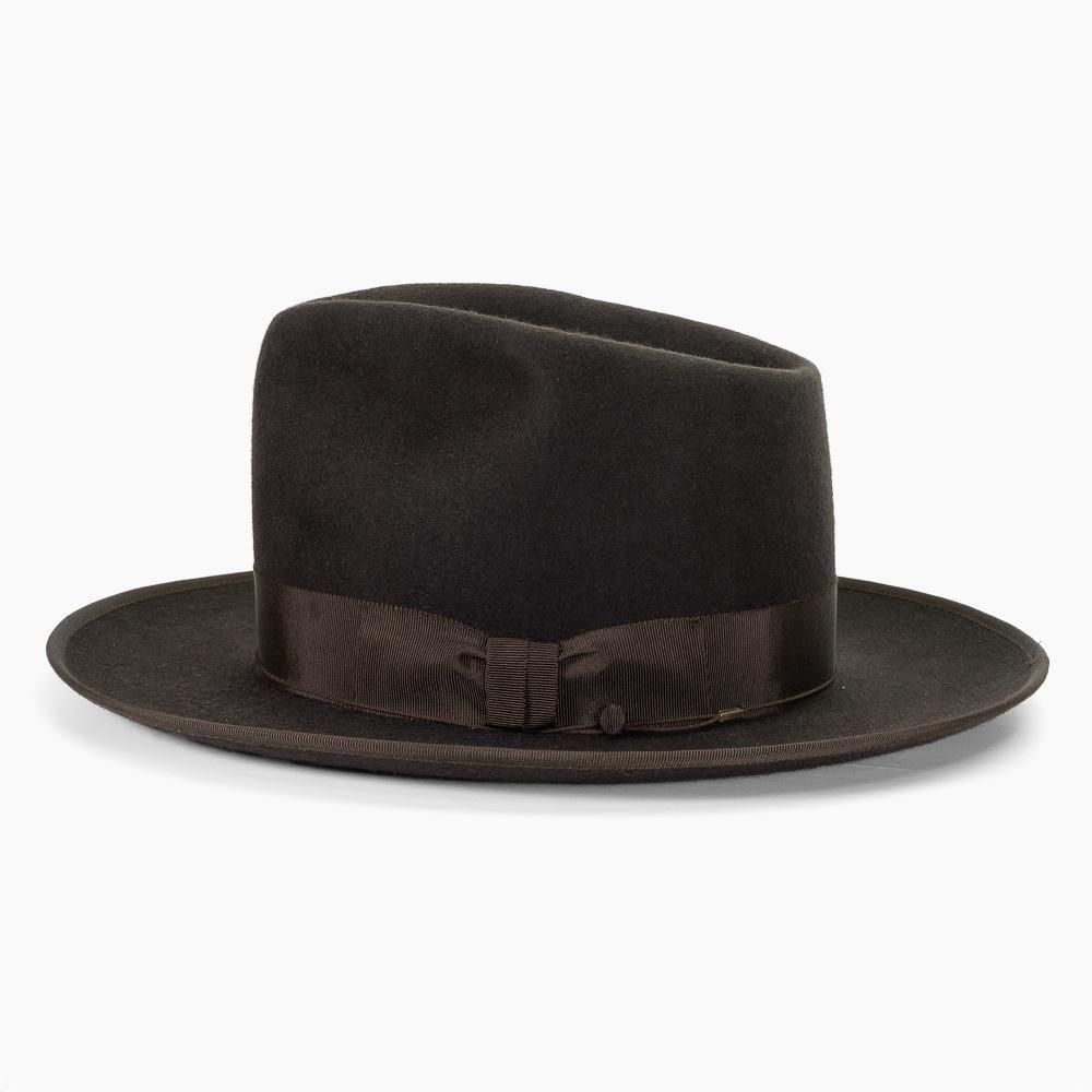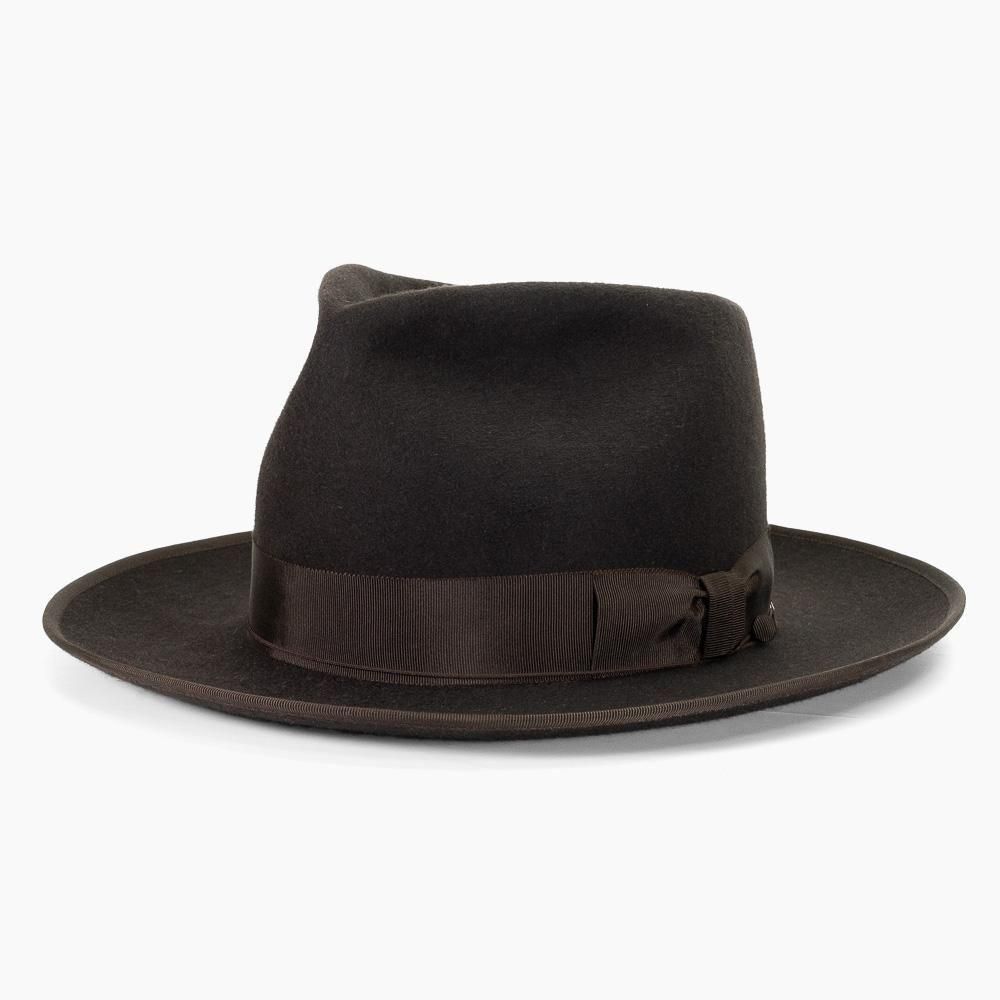 最大の特徴は、高さ13.5cmのハイクラウンと長さ8cmのロングブリムが織りなす圧倒的な存在感です。