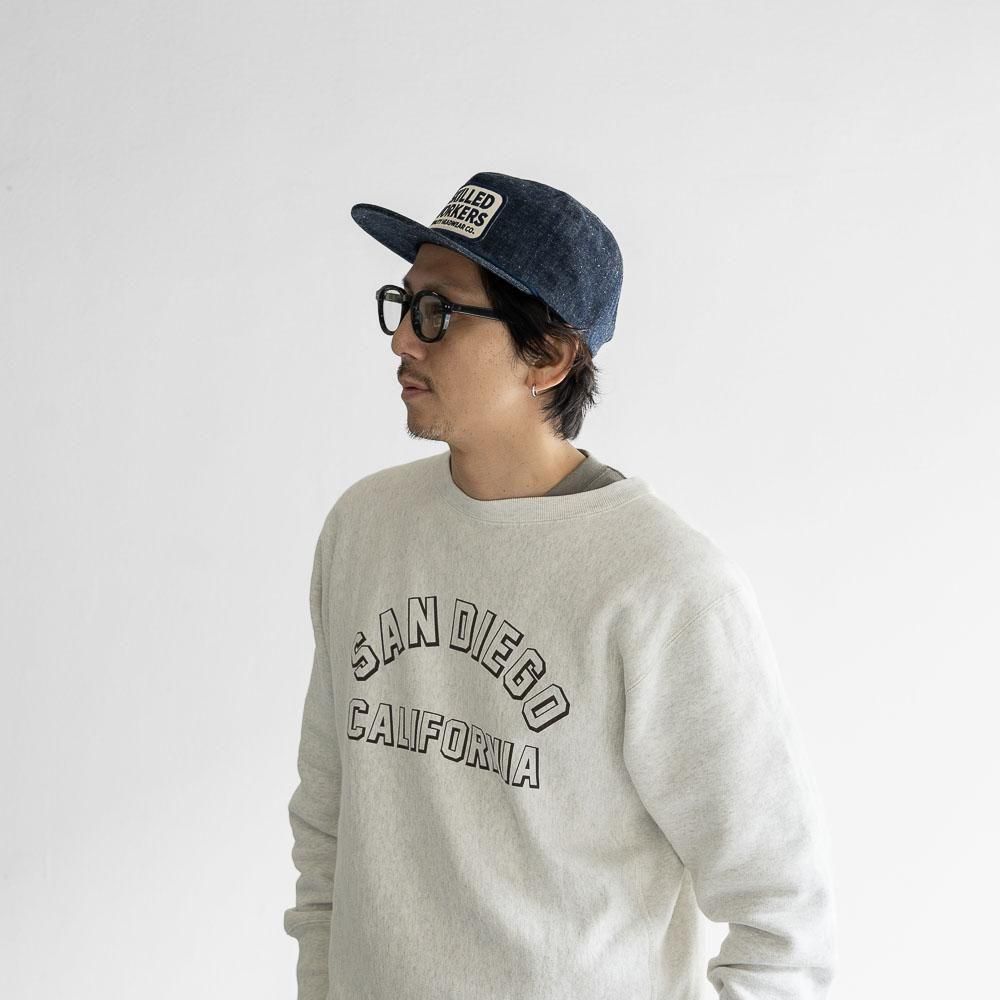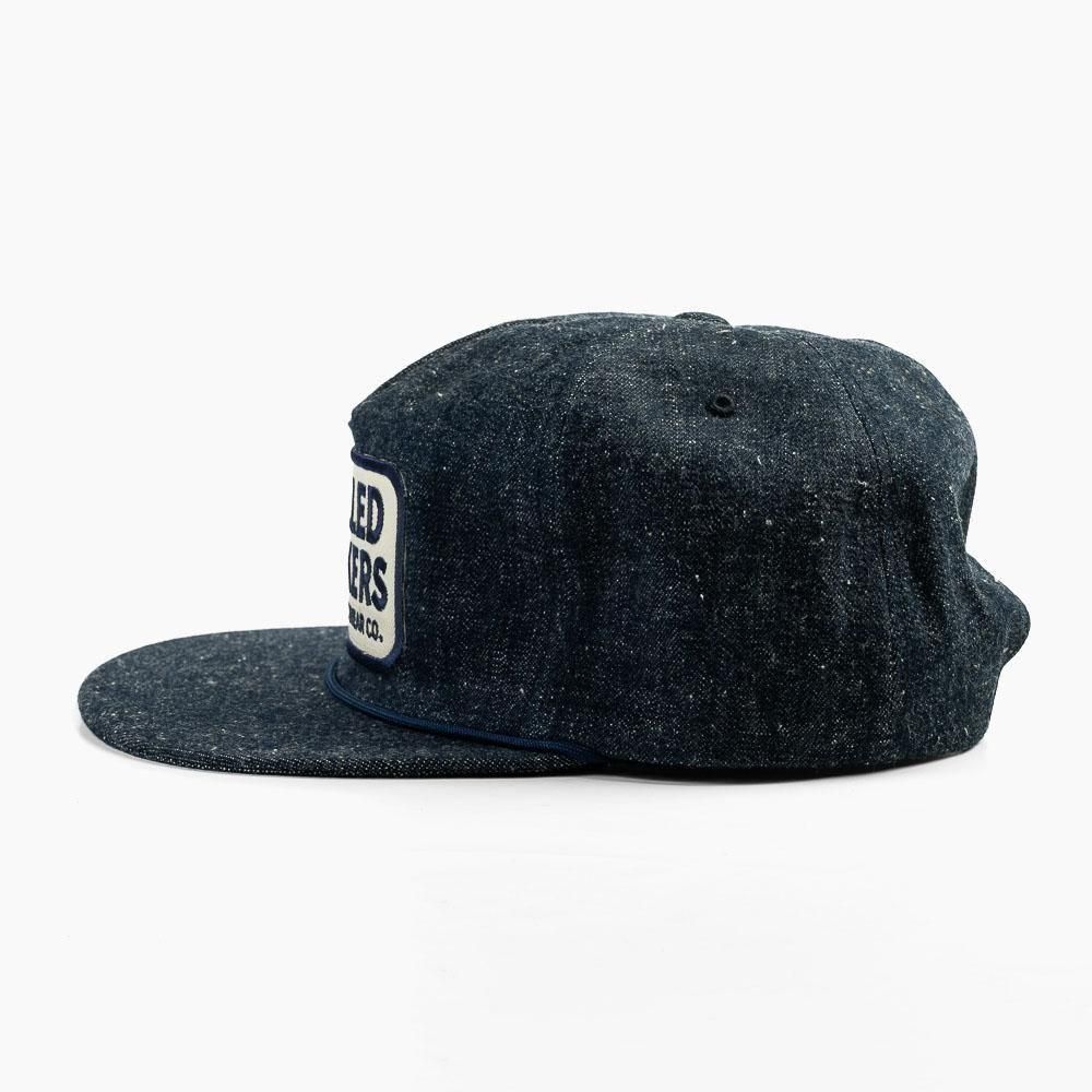 セルビッチネップデニムを使用したクラシカルな5パネルトラッカーキャップ。